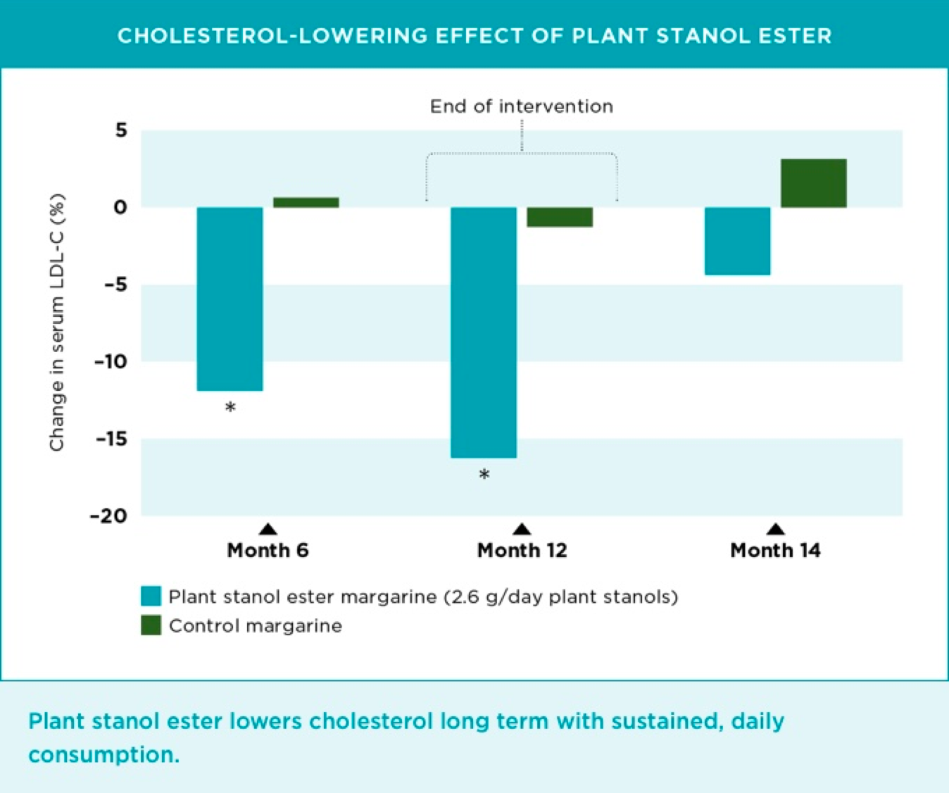 Clinical data have shown that the cholesterol-lowering effect of plant stanol ester was sustained throughout a 12-month intervention period3. However, follow-up sampling 2 months after the intervention period ended showed that LDL-C rose back to starting levels, suggesting that plant stanol ester needs to be continuously consumed on a daily basis to gain long-term benefits3.