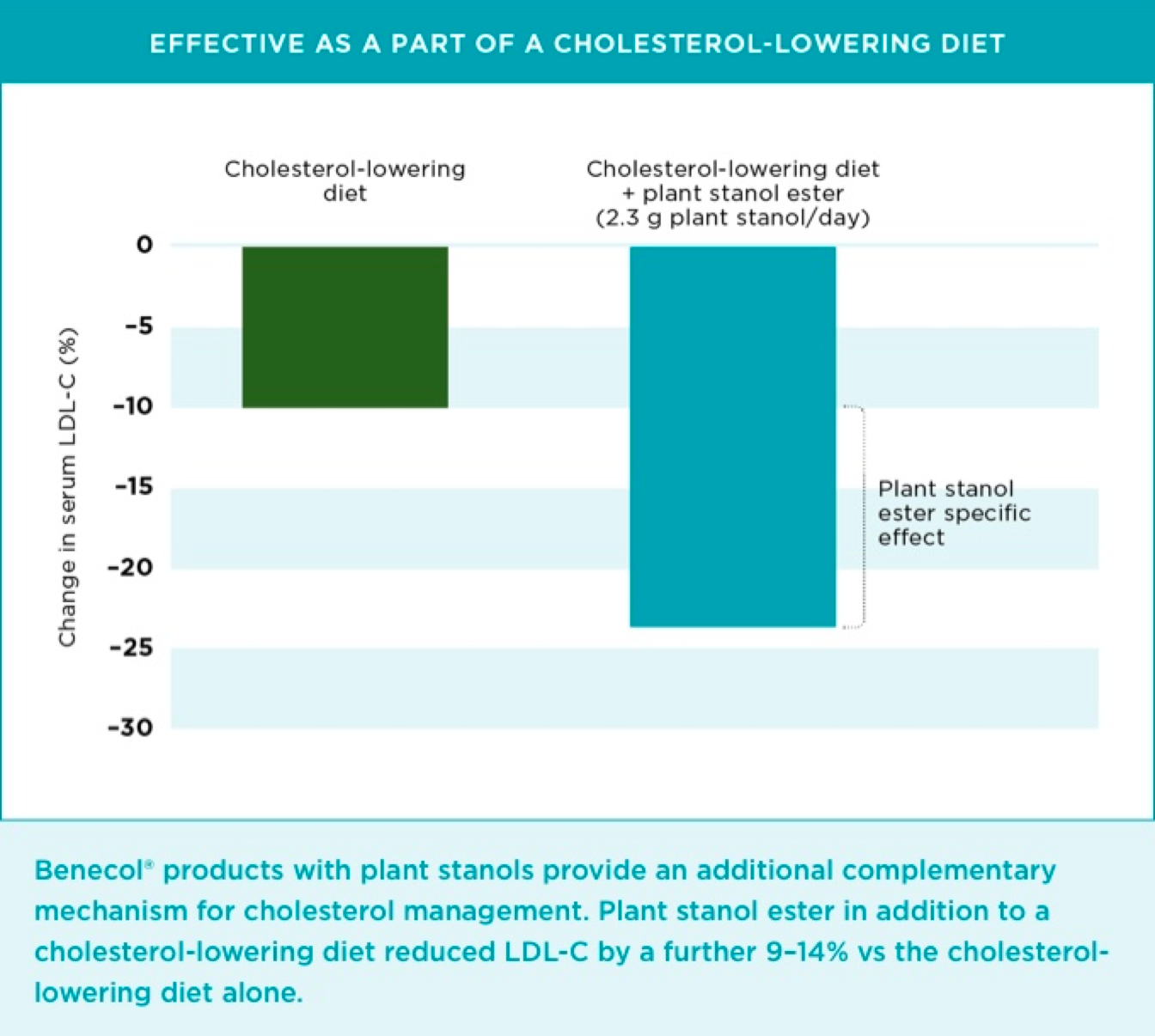 Studies have shown that the cholesterol-lowering effect of plant stanol ester and that of a healthy, lipid-lowering diet are additive and that plant stanol ester can dose dependently reduce LDL-C by an additional 9–14%13,24compared to a low-fat diet alone.